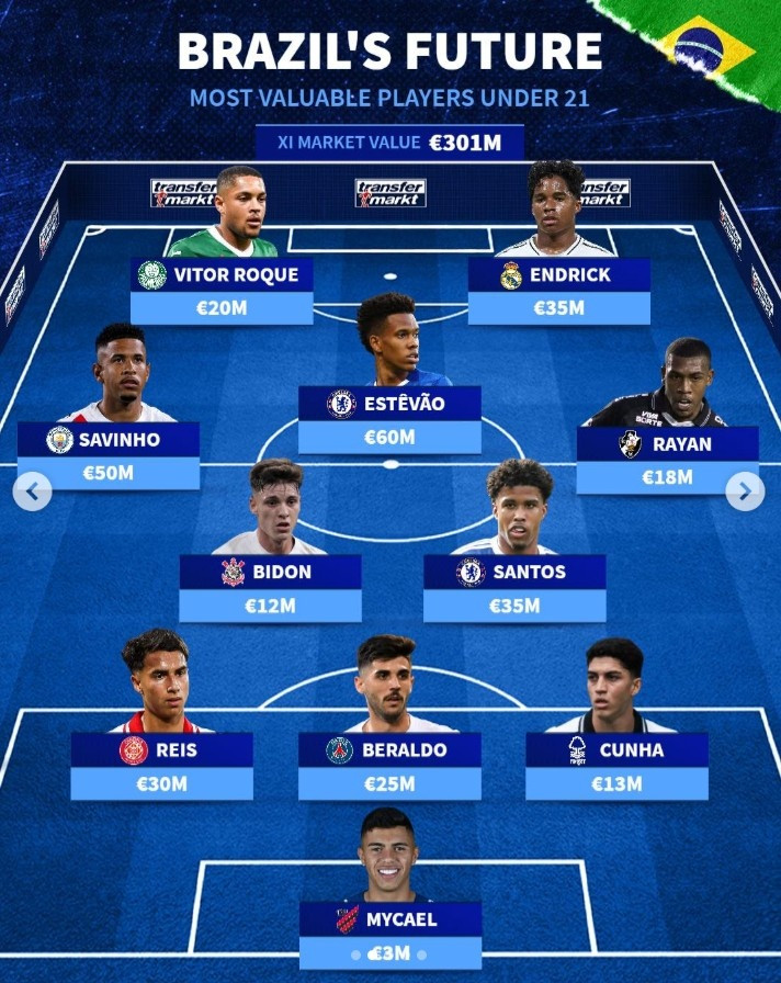 Ngày 12 tháng 10, Xunde đã liệt kê đội U21 Brazil đắt giá nhất, trong đó Esteban có giá trị cao nhất với 60 triệu euro. Roque và Endrick tiến lên, Saviho có tên trong danh sách. Tổng giá trị của đội là 301 triệu euro.