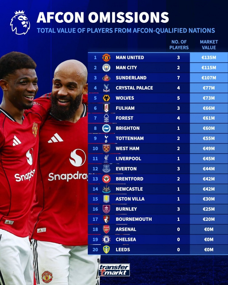 Danh sách giá trị cầu thủ Cúp bóng đá châu Phi cho mỗi đội Premier League: Hai đội đứng đầu Manchester United và Manchester City, không có ai từ Pháo thủ và The Blues sẽ tham gia