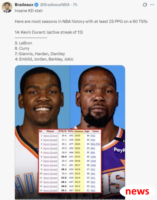 Cho đến nay, Durant đã đạt được một kỳ tích 25+ mỗi trò chơi và tỷ lệ bắn thực sự là 60% trong 14 mùa trong sự nghiệp của mình. Nhìn vào lịch sử NBA, nó cũng là một sự tồn tại độc đáo, và nó nằm ngoài tầm với của Jordan.